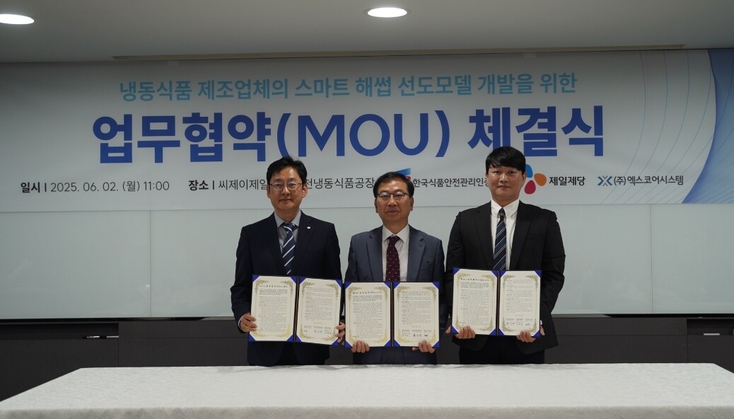 [하비엔뉴스 = 김혜연 기자] 한국식품안전관리인증원(원장 한상배, 해썹인증원)과 CJ제일제당(대표이사 강신호), 엑스코어시스템(대표 양용희)는 지난 2일 씨제이제일제당 인천공장에서 냉동식품 제조업체의 스마트 해썹 선도모델 개발을 위한 업무협약(MOU)을 체결했다고 4일 밝혔다.