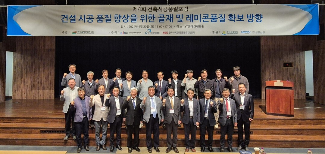 | 한국골재산업연구원이 주관한 제4회 건축시공품질포럼이 지난 4월 30일 서울 양재동 aT센터(한국농수산식품유통공사)에서 열린 가운데 참석자들이 기념사진을 촬영하고 있다. [사진=한국골재산업연구원] |