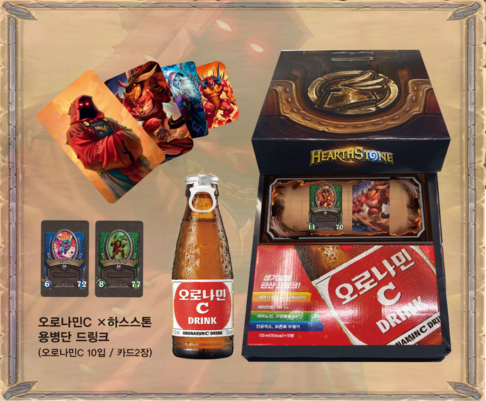 ‘오로나민C X 하스스톤 용병단 드링크’는 지난 10월 하스스톤에 추가된 게임모드 ‘용병단’의 협업 상품으로, 오로나민C 1박스(10입)와 캐릭터 쿠폰팩 카드 1장, 용병 카드 1장으로 구성됐다.