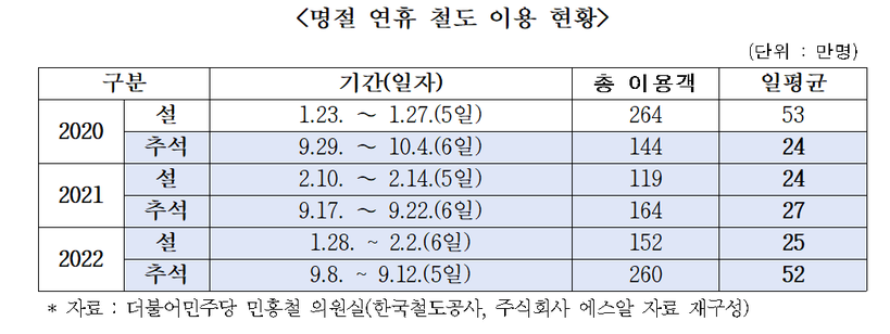 국회 국토교통위원회 소속 민홍철 의원(더불어민주당‧경남 김해갑)이 한국철도공사, 에스알, 한국공항공사, 한국도로공사로부터 제출받은 자료에 따르면, 지난 2020년 추석 명절 이동량 대비 철도는 117%, 항공은 41%, 고속도로는 27% 증가했다.