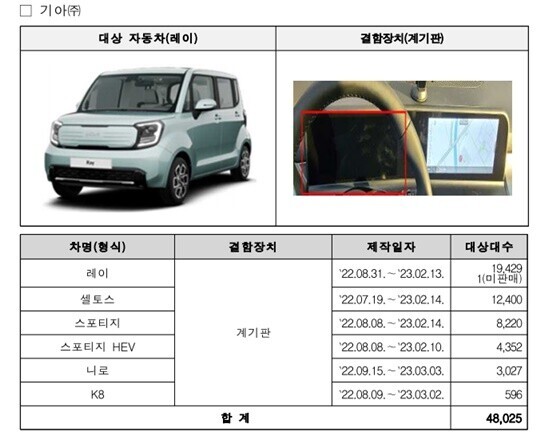 국토부에 따르면, 기아 레이·셀토스·스포티지·스포티지 하이브리드·니로·K8 총 6개 차종 4만8025대는 계기판 소프트웨어 설정 오류로 계기판 화면이 표시되지 않아 안전에 지장을 줄 가능성이 확인돼 오는 13일부터 시정조치에 들어간다.