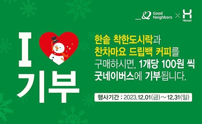[하비엔뉴스 = 윤대헌 기자] 도시락 프랜차이즈 한솥은 12월 한 달간 ‘착한도시락’ 기부 행사를 진행한다고 7일 밝혔다.