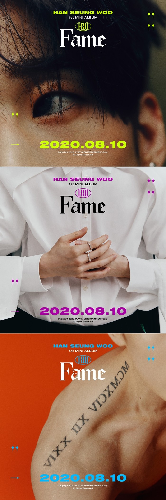 공개된 'HAN’, ‘SEUNG’, ‘WOO' 3종 버전의 앨범 티저 이미지는 한승우의 눈, 손, 어깨를 강조하며 감각적인 분위기로 눈길을 끈다. 순수함부터, 댄디함, 섹시함까지 한승우의 매력을 다채로운 콘셉트로 표현한 티저가 미니 1집 'Fame'에 대한 궁금증을 자극한다.