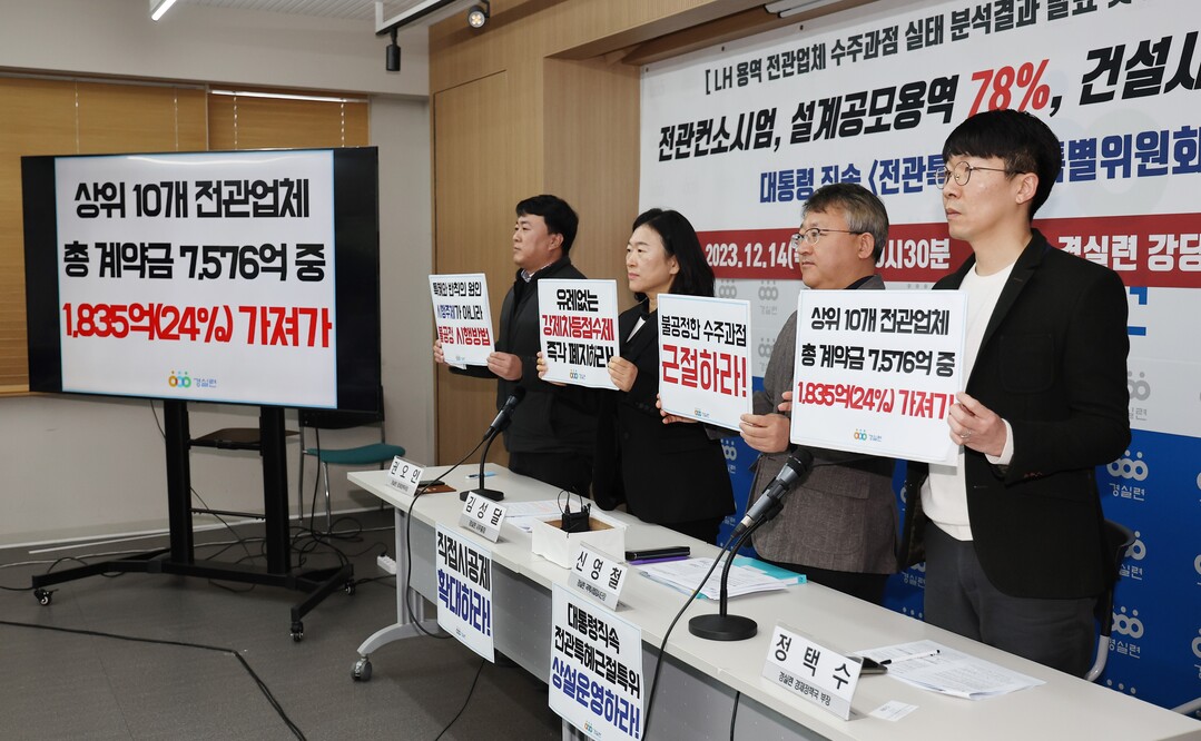 경실련에 따르면, 지난해 1월부터 올해 6월까지 설계공모 방식으로 체결된 LH 발주 설계용역 계약 95건 가운데 68건(71.5%)을 전관업체가 포함된 컨소시엄이 수주했고, 계약금은 전체 금액(2475억원)의 77.8%인 1928억원에 달했다.