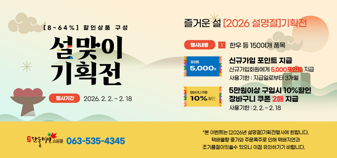 시는 민족 최대 명절인 설을 기념해 시민과 전국의 소비자들에게 합리적인 가격으로 고품질의 지역 특산물을 제공하고자 ‘2026 설명절 기획전’을 개최한다고 30일 밝혔다. 이번 행사는 오는 2월 2일부터 2월 18일까지 17일간 정읍시 공식 농특산물 쇼핑몰인 단풍미인쇼핑몰을 통해 진행된다.