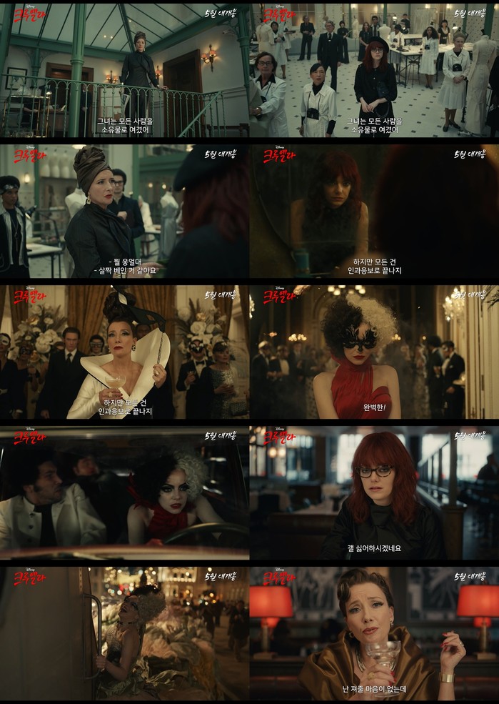 또한 영상 말미 “나한테 도전을 해왔잖아. 난 져줄 마음이 없는데”라는 ‘남작 부인’의 말에 의미심장한 미소를 짓는 ‘크루엘라’의 모습은 이들의 팽팽한 대립에 대한 긴장감을 증폭시킨다. 거기에 영상 속 펼쳐지는 트렌디한 의상과 압도적인 비주얼은 보는 이들의 감탄을 자아내며 영화에 대한 기대감을 고조시킨다.