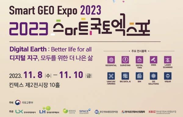 [하비엔뉴스 = 홍세기 기자] 국토교통부가 주최하고 LX한국국토정보공사와 LH한국토지주택공사, 국토연구원, 공간정보산업진흥원 등이 공동 주관하는 ‘2023 스마트국토엑스포’가 오는 11월8일부터 10일까지 일산 킨텍스에서 개최된다.