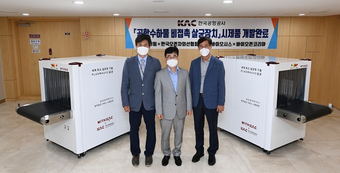 이번에 개발한 ‘공항 수하물 비접촉 살균장치’는 낮은 온도에서 단시간에 효율적으로 살균처리를 할 수 있는 플라즈마 및 세균 곰팡이와 미생물을 99.9% 살균할 수 있는 UVC 특성을 활용한 비접촉 수하물 살균장치이다.
