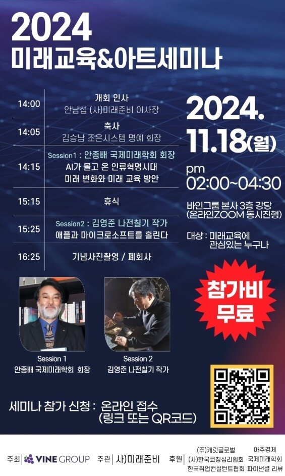 첫 번째 세션은 안종배 국제미래학회 회장이 ‘AI가 몰고 온 인류혁명시대 미래변화와 미래교육 방안’을 주제로, 두 번째 세션은 김영준 나전칠기 작가가 ‘애플과 마이크로소프트를 홀린다’를 주제로 강연에 나선다. 세미나는 링크 또는 QR코드를 통해 무료로 참여할 수 있다.