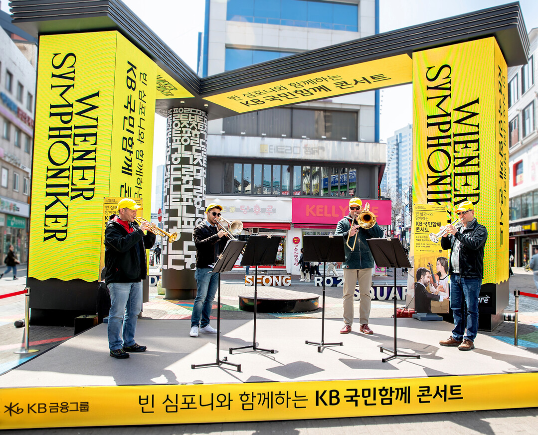 19일 KB금융에 따르면, 트럼펫 둘, 트롬본 둘로 구성된 금관 4중주단 ‘빈 심포니 콰르텟’이 지난 18일 대구 동성로에 위치한 아트스퀘어에서 깜짝 버스킹 공연을 펼쳤다.