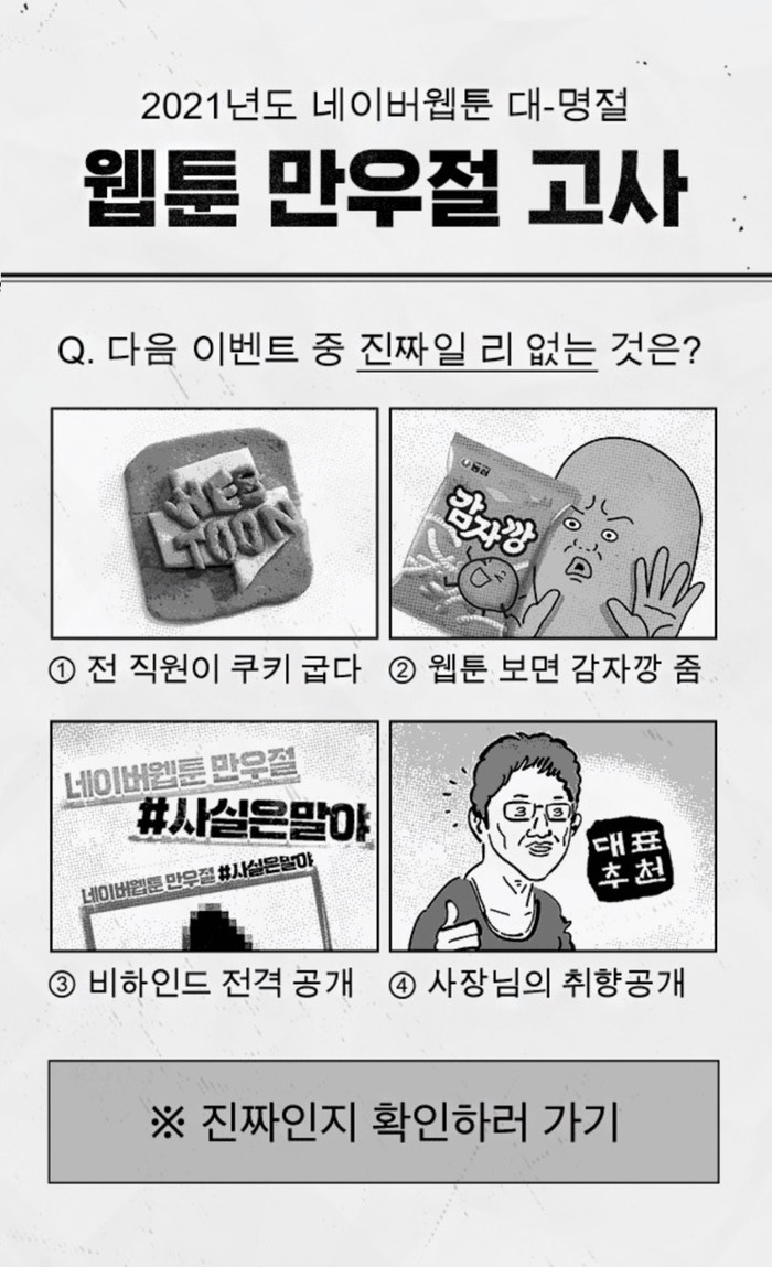 한편 만우절을 맞아 새롭게 변경한 네이버웹툰 작품 썸네일은 네이버웹툰 홈페이지와 모바일 웹, 앱에서 오늘 단 하루 동안 만나볼 수 있다.