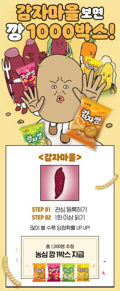 이와 함께 ‘감자마을 보면 감자깡 드림’ 이벤트도 준비됐다. 오는 7일까지 네이버웹툰 ‘감자마을’을 관심 등록하고 1화 이상 열람한 독자들 중 1000명을 추첨해 농심깡 4종(감자깡·고구마깡·옥수수깡·양파깡) 세트를 증정한다. 자세한 내용은 네이버웹툰 공식 홈페이지에서 확인할 수 있다.