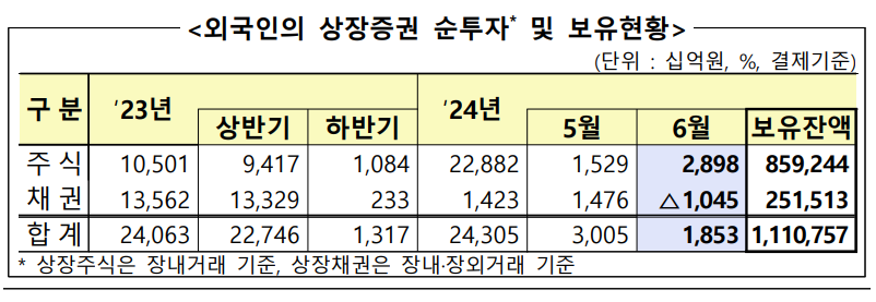 한편 6월 말 기준 외국인은 1110조8000억원의 상장증권을 보유한 것으로 집계됐다.