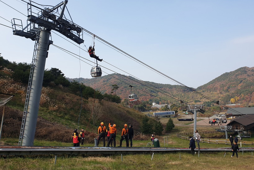 [하비엔=홍세기 기자] 무주덕유산리조트가 최근 설천베이스 에코 리프트에서 재난 상황에 대비한 리프트 긴급구조 가상훈련을 실시했다.