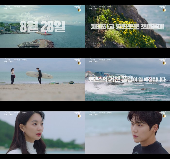 조용하고 한적한 바닷가를 거닐던 신민아와 서핑을 즐기고 나온 김선호가 우연히 마주치는 장면은 ‘쾌청하고 평화로운 갯마을에 로맨스의 거센 풍랑이 일 예정입니다’라는 카피와 오버랩되면서 두 사람 인연의 시작을 더욱 궁금하게 만든다.