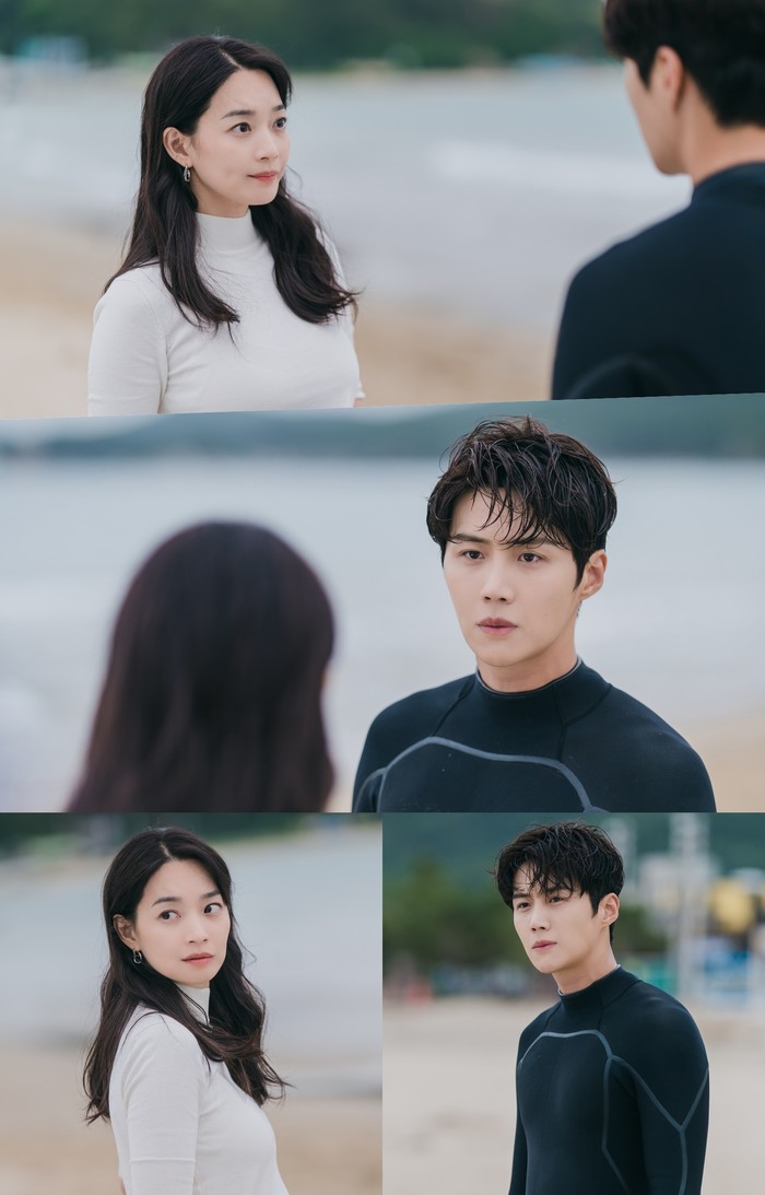 이번에 공개된 스틸에는 그림처럼 예쁜 바닷가를 배경으로 서로 마주보고 서 있는 신민아와 김선호의 모습이 담겨있다. 먼저 어디선가 갑자기 나타난 김선호의 등장에 깜짝 놀란 듯 토끼처럼 커다래진 눈망울로 그를 바라보는 신민아에게서는 귀여운 매력까지 엿보인다. 이어 서핑 수트를 입고 있는 김선호는 깊어진 눈빛에 더해진 젖은 머리칼이 그 매력에 화룡점정을 찍으며 눈을 뗄 수 없게 만든다. 때문에 서로를 향해 눈빛을 주고 받고 있는 두 사람의 모습은 더 이상의 설명이 필요 없이 그 자체만으로도 설렘을 무한 자극한다.