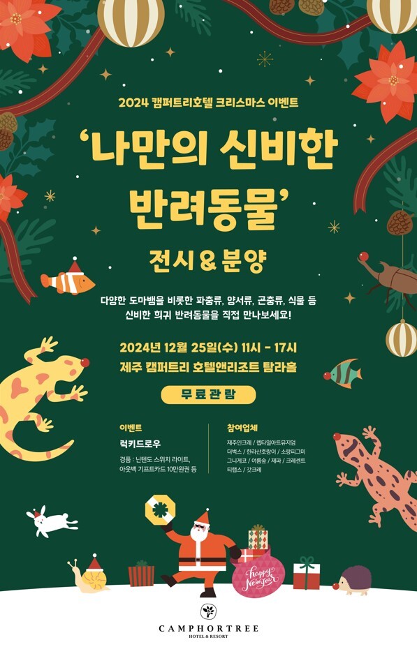 크리스마스 당일인 오는 12월25일 탐라홀에서 펼쳐지는 ‘나만의 신비한 반려동물’은 파충류를 비롯한 다양한 희귀 동물을 만나볼 수 있는 행사로, 100% 당첨 럭키드로 이벤트를 통해 선물을 증정하고 수익금 전액은 공익 단체에 기부될 예정이다.