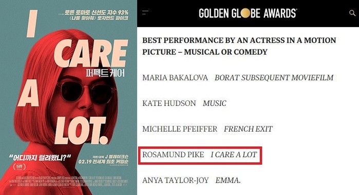 2021년을 시원하게 털어버릴 첫 번째 케이퍼 무비 <퍼펙트 케어>가 2021년 2월 3일 오전 8시 30분(미국 현지 시각 기준), 제78회 골든 글로브 시상식 뮤지컬, 코미디 여우주연상 부문에서 로자먼드 파이크의 노미니 소식을 알려 전 세계 씨네필의 이목이 집중됐다.
