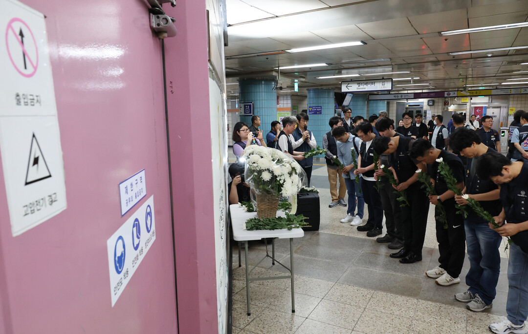 | 서울교통공사노동조합 소속 조합원들이 지난해 지하철 3호선 연신내역 전기실 작업 중 발생한 사망 사고 관련 9일 사고현장 부근에서 전기직 노동자 산재 사망 1년 추모제를 열고 헌화하고 있다. [사진=연합뉴스] |