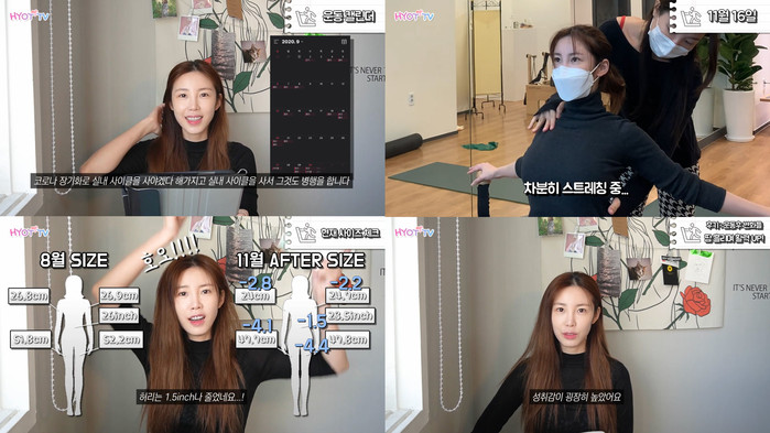 전효성은 “저도 몸무게가 아닌 눈 바디, 사이즈 체감에 조금 더 신경을 쓰다보니까 다이어트를 하면서 받는 스트레스가 훨씬 적었고, 옷 입으면서 기분이 좋았다. 운동을 하고 살짝 땀이 날 때 활력이 넘치는 기분이 들어 성취감이 높았다”라며 생생한 후기와 함께 다이어터들에게 응원을 전하며 영상을 마쳤다.