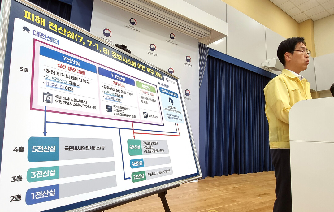 | 김민재 중앙재난안전대책본부 제1차장(행정안전부 차관)이 9일 정부세종청사 민원동 공용브리핑실에서 국가정보자원관리원 행정정보시스템 화재 관련 중앙재난안전대책본부 브리핑을 하고 있다. [사진=연합뉴스] |
