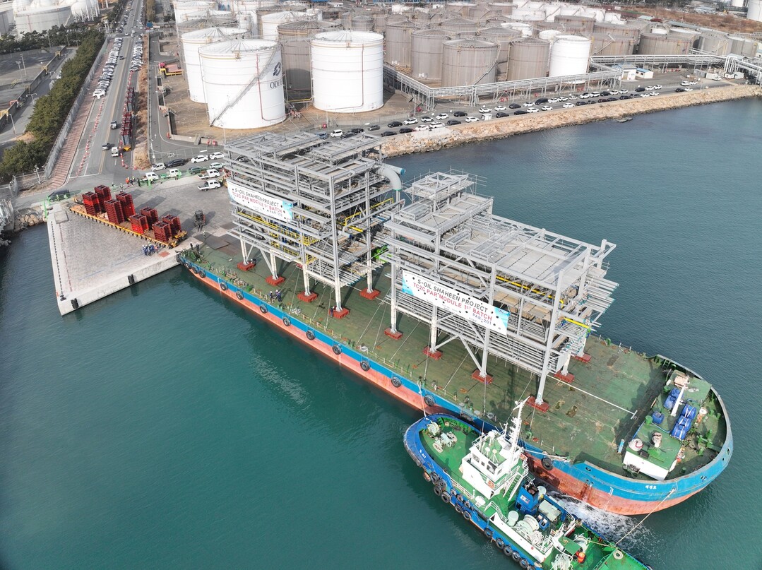 | 샤힌 프로젝트 대형 모듈을 실은 바지선이 울산신항 부두에 접안하는 작업을 하고 있다. [사진=DL이앤씨] |