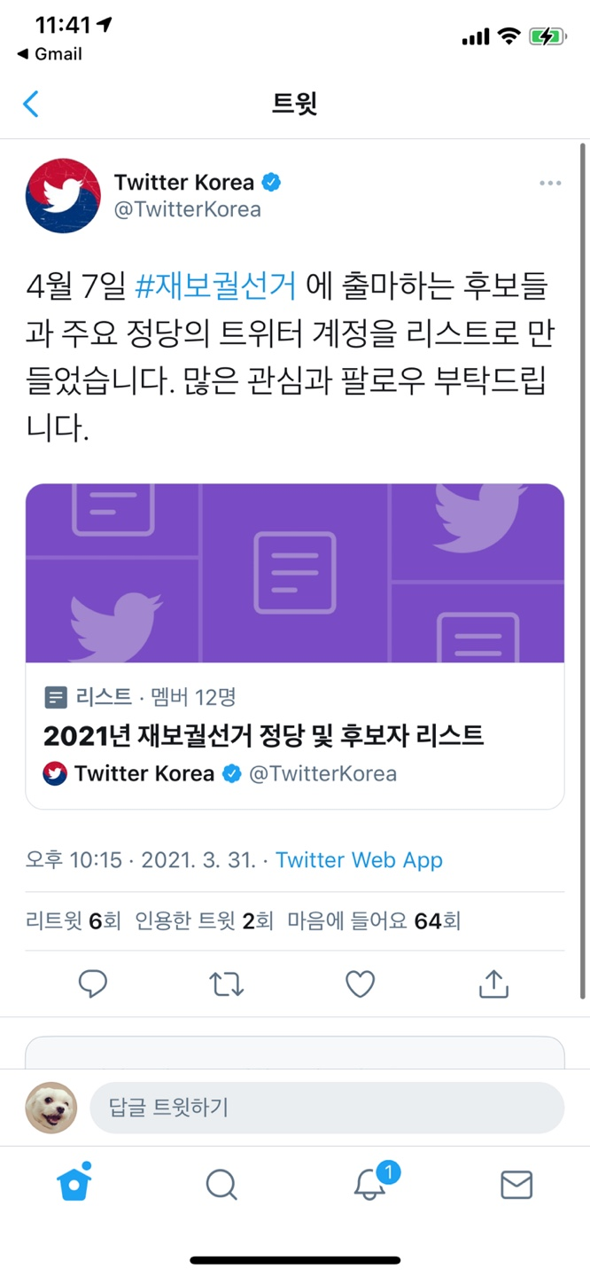 ▲사진 설명: 트위터코리아 공식 계정에 게시된 ‘2021년 재보궐선거 정당 및 후보자 리스트’ 트윗