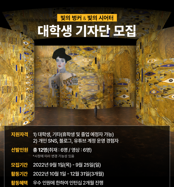 대학생 기자단은 MZ세대의 트렌드를 반영한 참신한 아이디어와 인사이트를 통해 몰입형 예술 전시관 ‘빛의 벙커’와 ‘빛의 시어터’를 비롯해 현재 전시 중인 ‘구스타프 클림트: 골드 인 모션’ 등 최근 한류문화 콘텐츠로 주목받고 있는 몰입형 미디어아트를 알릴 예정이다.