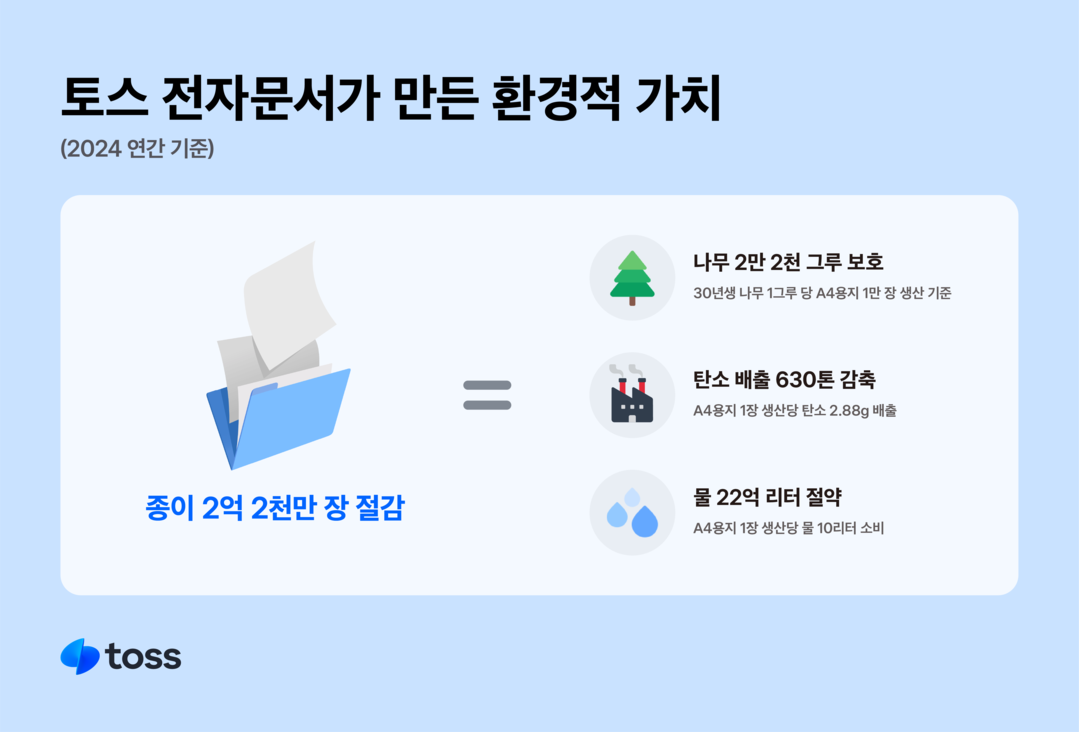 토스가 2024년에 발급한 전자문서는 총 2억2000만건에 달한다. A4용지 1장(5g) 기준으로 환산 시 약 1100톤에 해당하는 종이 2억2000장을 절약한 셈이다. A4용지 1만장을 생산하는 데 30년생 나무 1그루가 필요하다는 점을 고려하면, 이는 약 2만2000그루의 나무를 보호한 것과 같다. 또 종이를 생산할 때 발생하는 탄소 약 630톤(장당 2.88g), 물 약 22억 리터(장당 10리터)의 절감 효과도 거둔 것으로 추산된다.
