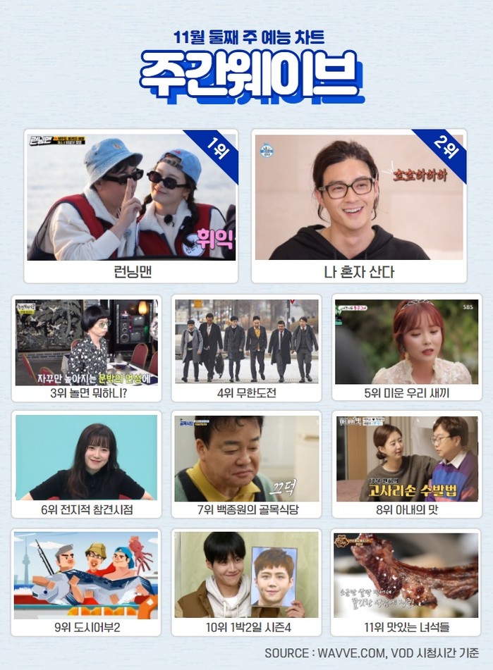 [하비엔=노이슬 기자] 부동의 순위로 여겨지던 주간웨이브 예능 차트 상위권에 오랜만에 변화가 찾아왔다. 지난 주까지 2위를 유지해 온 '놀면 뭐하니'와 3위 '나 혼자 산다'가 12주만에 순위를 바꾼 것.