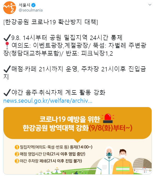 한편 서울시는 이번주 금요일~일요일 오후 7시부터 10시까지를 집중 계도 기간으로 정하고 공무원, 자원봉사자가 함께 사회적 거리두기와 마스크 착용 등 계도 활동에 나설 계획이다.