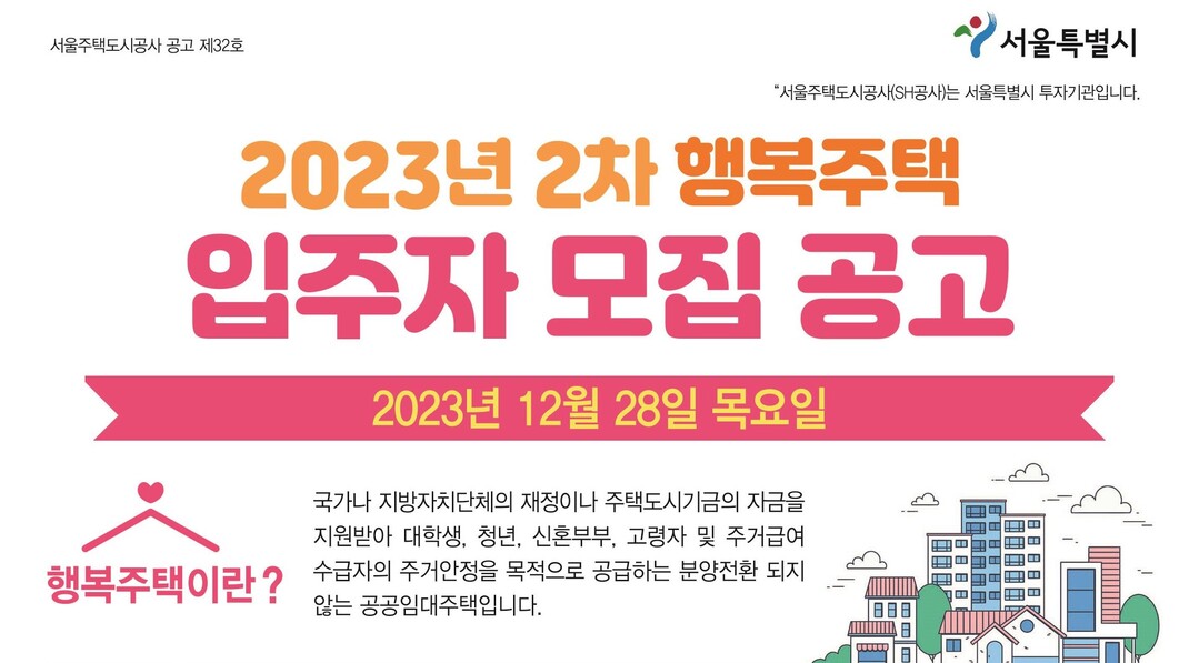 [하비엔뉴스 = 조정현 기자] 서울주택도시공사(이하 SH공사)는 ‘행복주택’ 1245세대를 공급하고, 내달 9~11일 SH인터넷청약 홈페이지에서 청약접수를 받는다고 28일 밝혔다.