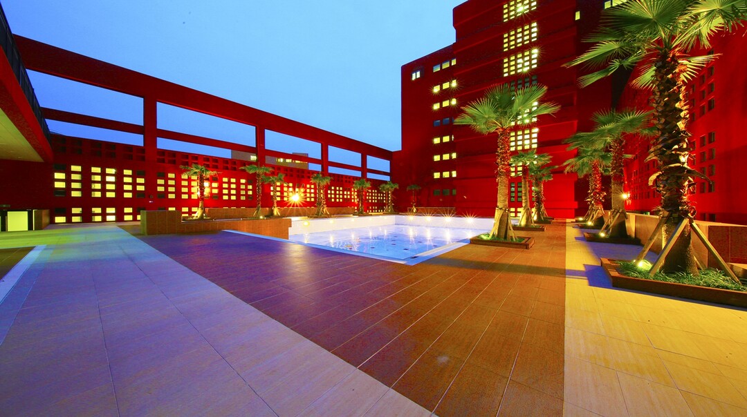 해당 야외수영장은 오렌지색 건물 외관과 야자수가 조화된 이국적인 경관으로 알려졌다.