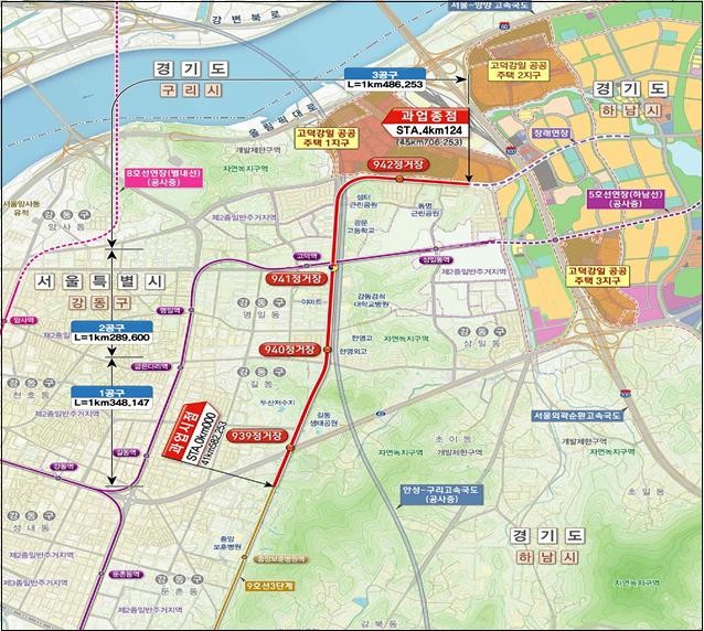 ‘도시철도 9호선 4단계 연장사업’은 고덕 강일지구 광역교통개선대책의 일환으로 현재 9호선 종점역인 중앙보훈병원역에서부터 5호선 환승역을 거쳐 고덕강일 1지구에 이르는 4.12km 구간에 총 사업비 6408억원을 투입해 4개역(환승역 1개소)을 신설하는 대규모 사업이다.