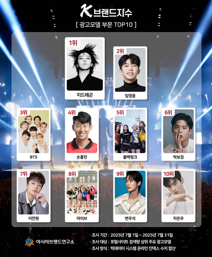해당 순위는 아시아브랜드연구소가 7월 1일부터 7월 31일까지 포털사이트 검색량 상위 주요 광고모델을 대상으로 온라인 빅데이터 11억 2629만 8846건을 분석한 결과로, 트렌드·미디어·소셜·긍정·부정·활성화·커뮤니티 7개 인덱스의 가중치 배제 기준을 적용한 합산 수치로 산출했다.