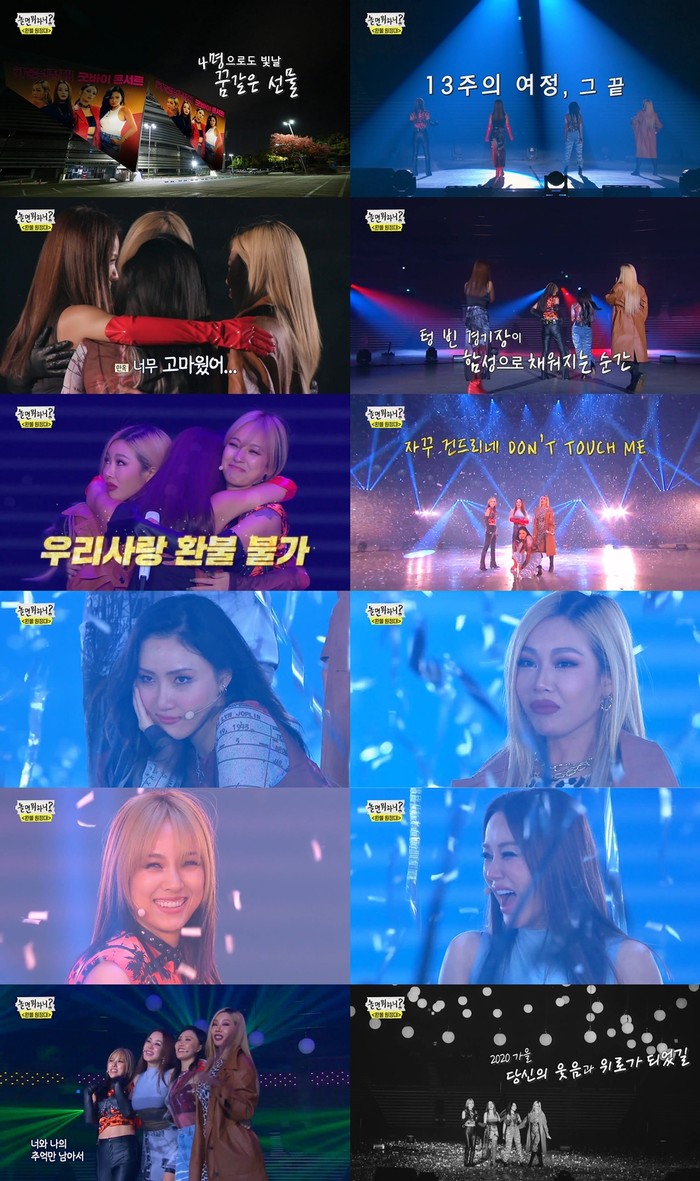 [하비엔=노이슬 기자] MBC ‘놀면 뭐하니?’ 환불원정대가 3개월간의 뜨거운 여정을 마치고 활동을 종료했다. 오로지 환불원정대만을 위해 특별히 마련된 무대에 선 멤버들은 콘서트장을 방불케 하는 떼창과 환호 속에 감격과 환희의 눈물을 흘리며 열정적인 ‘DON’T TOUCH ME’(돈 터치 미) 무대를 꾸몄다.