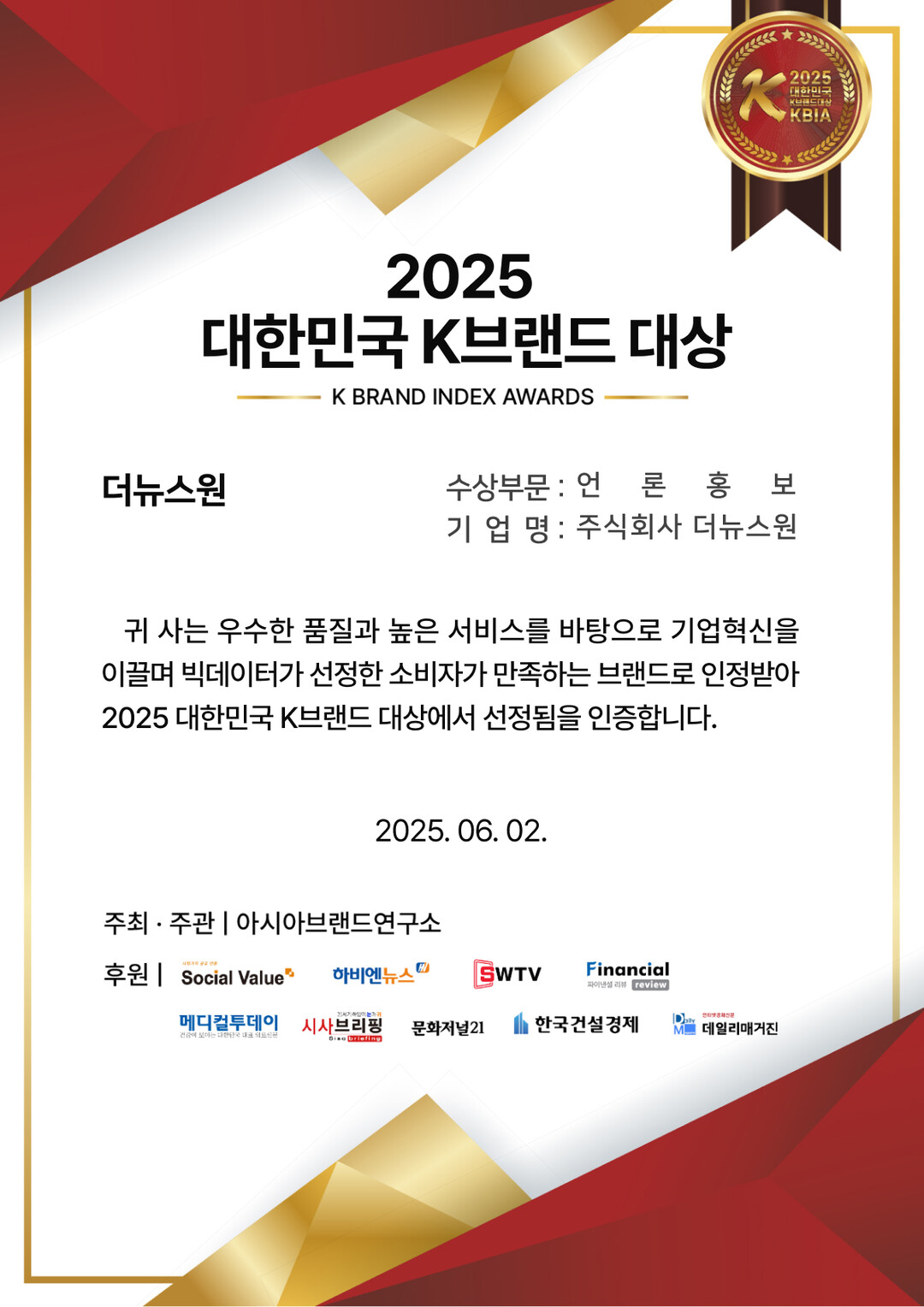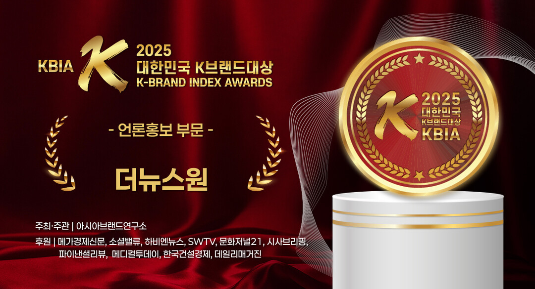 [하비엔뉴스 = 정동환 기자] 아시아브랜드연구소는 ‘2025 대한민국 K브랜드대상’ 언론홍보 부문에서 더뉴스원이 수상기업으로 선정됐다고 5일 밝혔다.