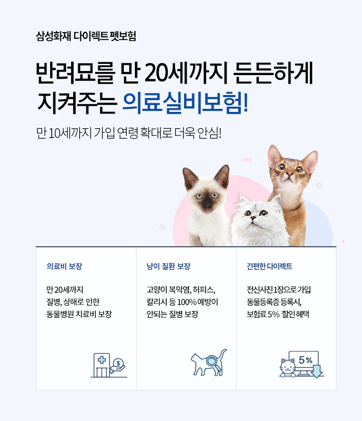 [하비엔뉴스 = 송현섭 기자] 삼성화재는 상해·질병 입통원비 보장을 포함한 반려묘 다이렉트 펫보험 신상품을 출시했다고 24일 밝혔다.