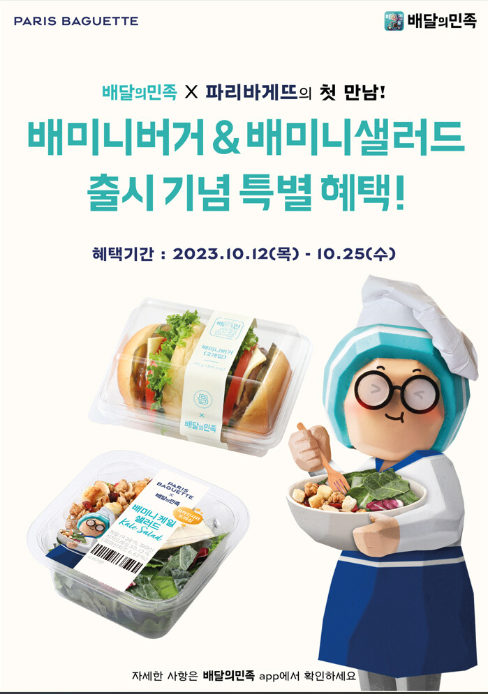 파리바게뜨는 배달의민족 주요 고객층인 2030세대를 겨냥해 가벼운 한 끼 식사로 즐기기에 좋은 미니 사이즈의 델리 신메뉴 2종을 개발했다. 또 배달의민족 마스코트 캐릭터인 ‘배달이’와 고유 폰트(한나체)를 활용한 패키지도 선보였다.