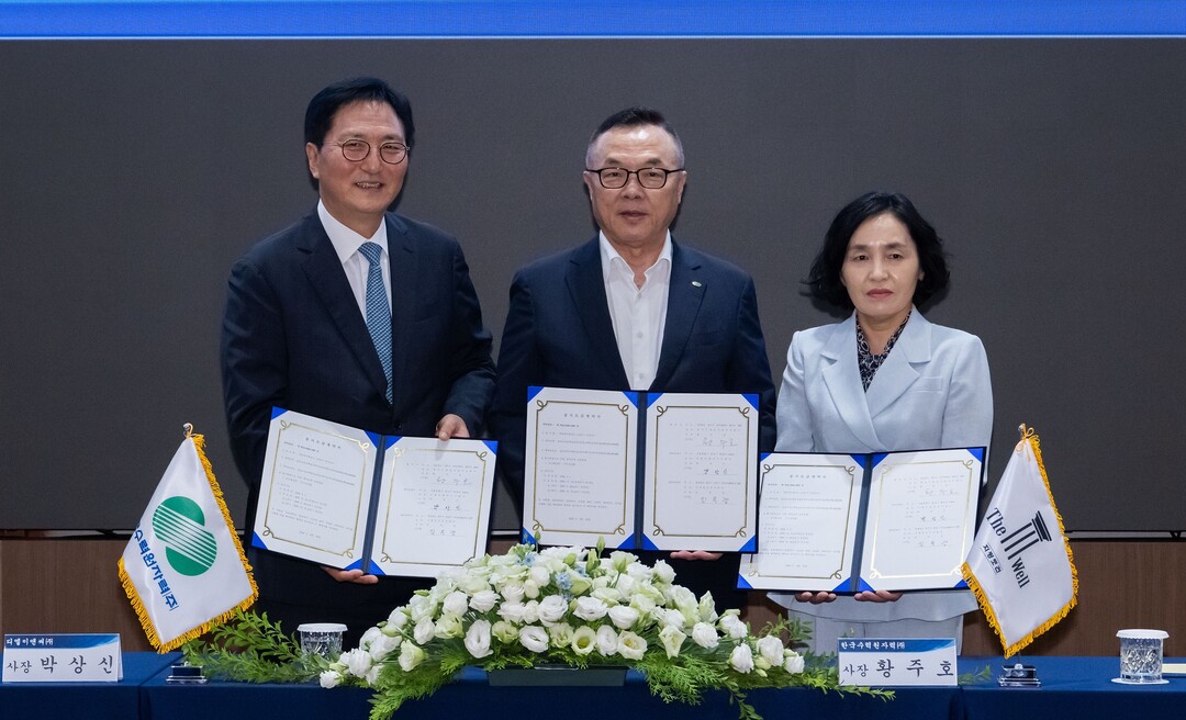 | 영동양수발전소 건설공사 계약 체결식에서 박상신 DL이앤씨 대표(왼쪽)와 황주호 한수원 사장(가운데)이 기념 촬영을 하고 있다. [사진=DL이앤씨] |