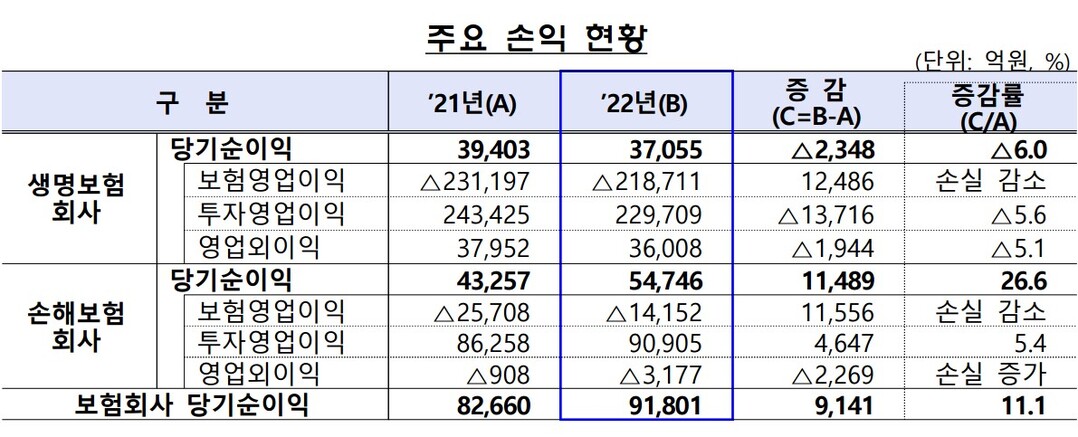 21일 금융감독원이 발표한 ‘2022년 보험회사 경영실적(잠정)’에 따르면 지난해 31개 손보사 당기순이익은 5조4746억원으로 전년보다 1조1489억원 늘어나 26.6%의 증가율을 기록했다.