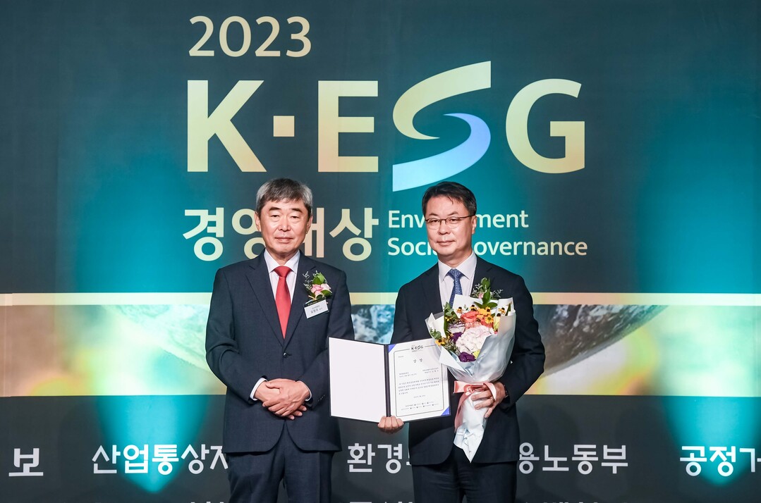 | 서정표 한화호텔앤드리조트 경영지원실장(오른쪽)이 ‘2023 K-ESG 경영대상’ 수상 후 유창조 KESG 경영대상 심사위원과 함께 기념촬영을 하고 있다. [사진=한화호텔앤드리조트] |