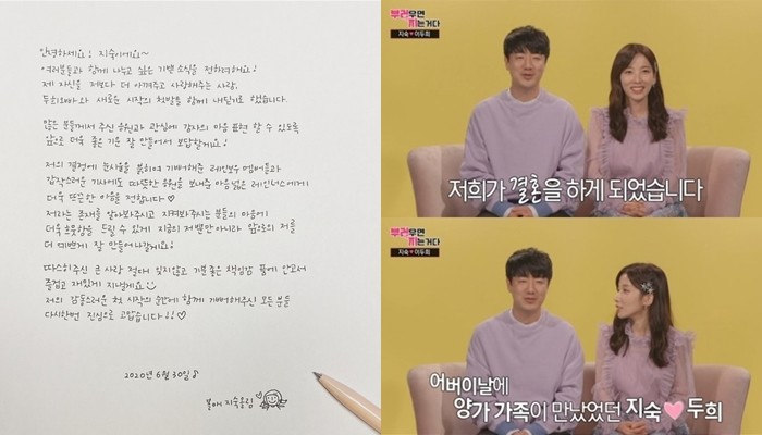앞서 지난 29일 종영한 MBC '부러우면 지는 거다'(이하 '부럽지')에서 지숙♥이두희 커플은 제작진과 인터뷰 중 결혼발표를 했다.