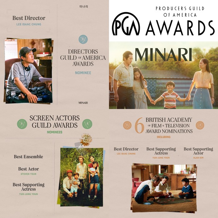 골든 글로브 수상작 <미나리>가 미국 감독조합(DGA)의 감독상부터 프로듀서조합(PGA)의 작품상과 배우조합(SAG)의 앙상블상까지 연이어 최고상에 노미네이트되어 오스카 레이스의 프론티어로 등극했다.