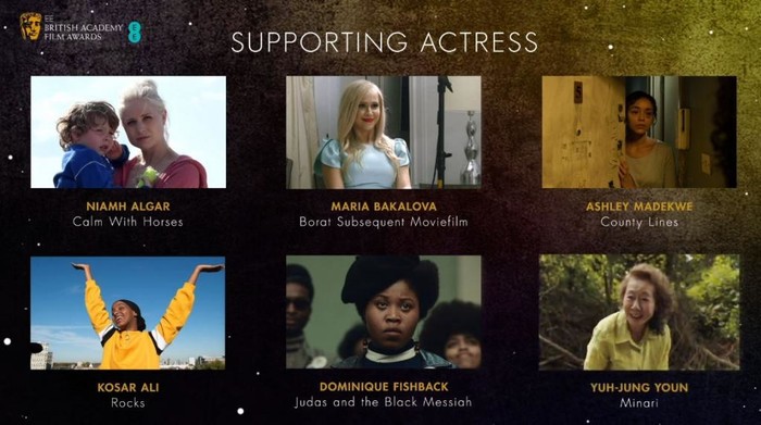 한편 영국 아카데미에서는 배우 윤여정이 여우조연상 부문에 이름을 올리며 한국 최초로 연기상 후보에 선정되었을 뿐만 아니라, 최우수 외국어영화상, 감독상, 남우조연상, 음악상, 캐스팅상까지 총 6개 부문에 노미네이트되었다.