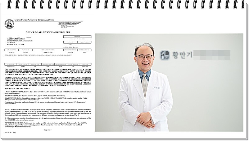 [HBN뉴스 = 이필선 기자] 황만기키본한의원 대표원장 황만기 한의학박사(서강대학교 겸임교수)는, ‘미국 특허청(United States Patent and Trademark Office, USPTO)’으로부터, 최근(2026년 1월 13일) ‘특허 등록 결정(허가) 통지서(Notice of Allowance)’를 받았다고 26일 밝혔다.