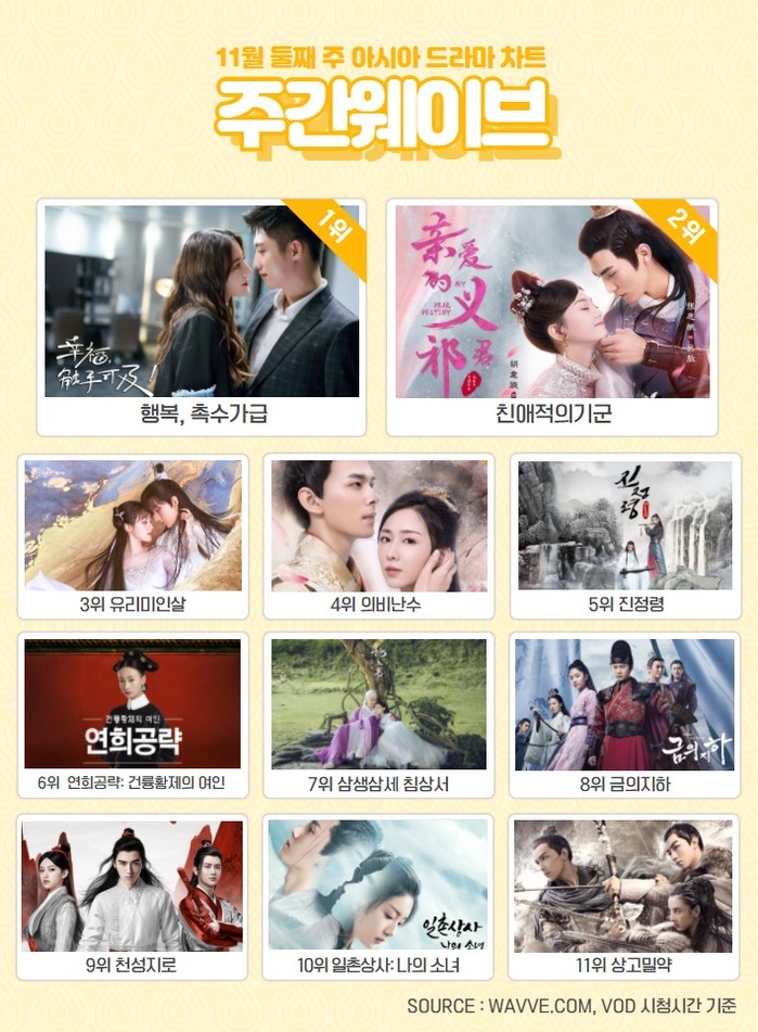 한편 ‘삼생삼세 침상서’, ‘금의지하’, ‘천성지로’, ‘상고밀약’ 등 다양한 고장극이 줄지어 차트 내에 자리하면서 퓨전 사극에 대한 식지 않은 열기가 계속되고 있다.