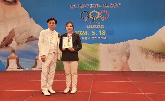 | 숭실사이버대학교 뷰티미용예술학과 출신 미용인 이지은씨가 ‘제36회 한국휴먼(미용&건강&패션)올림픽대회’에서 두피관리 부문 대상을 수상한 후 기념촬영을 하고 있다. |