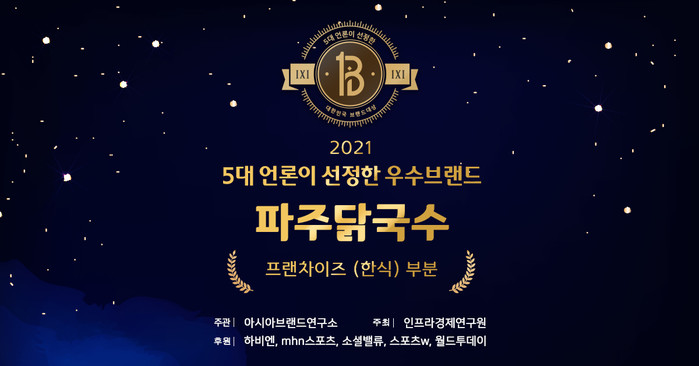 한식 프렌차이즈 업체 ㈜송정푸드의 파주닭국수가 국내 5대 언론이 뽑은 ‘올해의 대한민국 브랜드대상’에서 프랜차이즈 (한식)부문 우수 브랜드로 선정됐다고 6일 밝혔다.