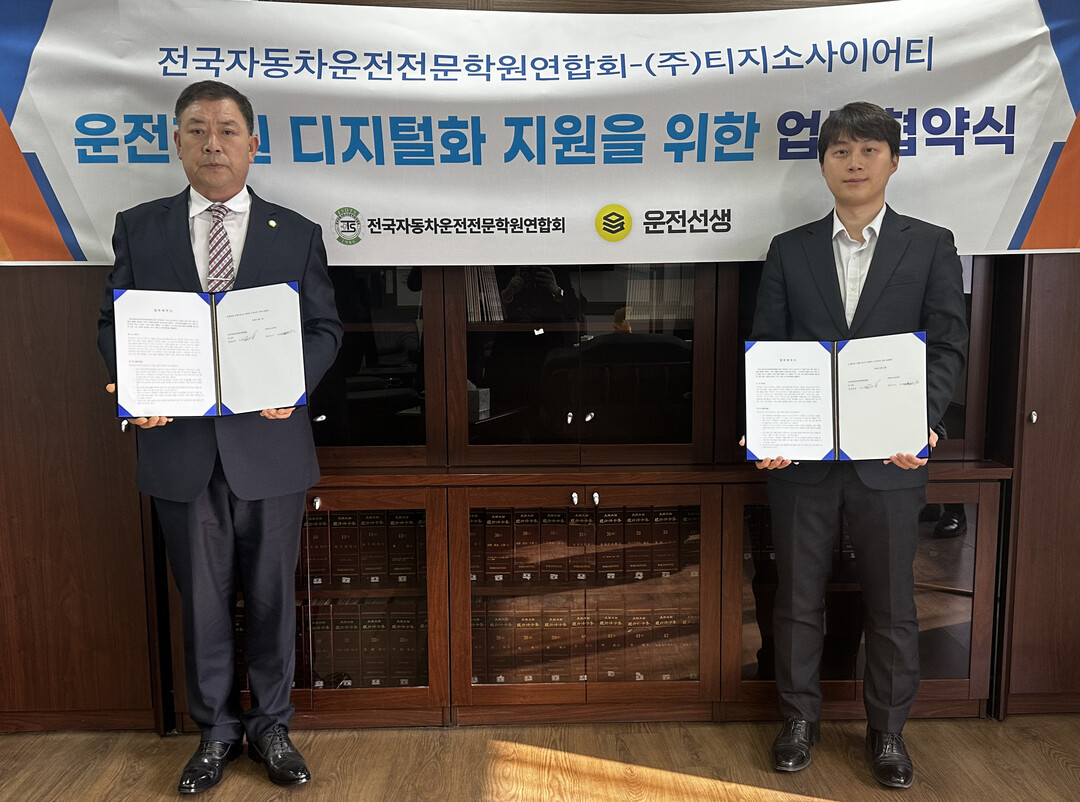| 지난 11일 티지소사이어티의 ‘운전선생’은 운전학원 디지털화 지원을 위해 전국자동차운전전문학원연합회와 업무협약을 체결했다. [사진=티지소사이어티] |